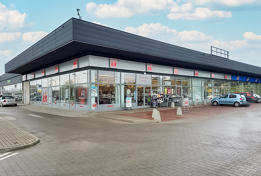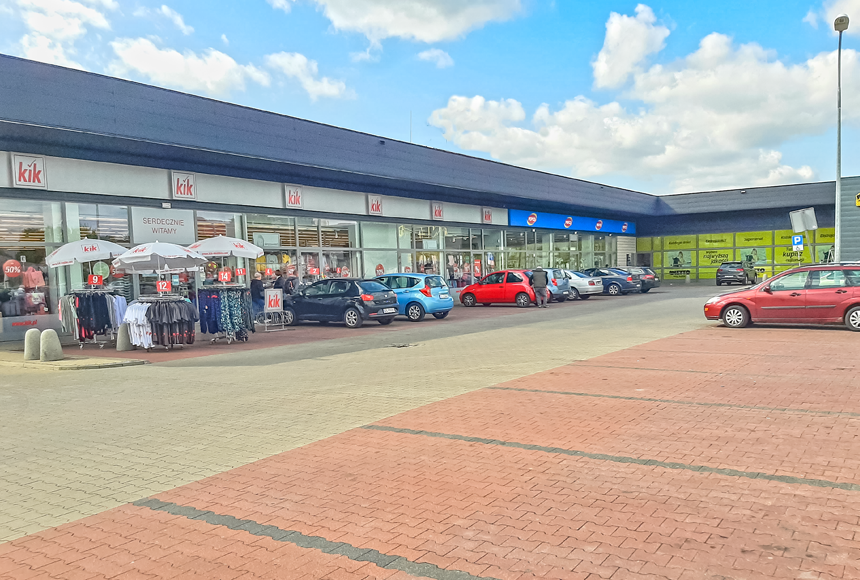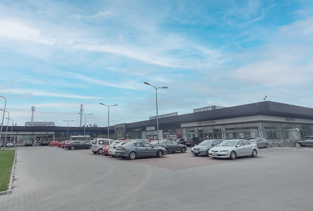 Small shopping mall forming part of a larger building with a Netto grocery store. There is a Lotos petrol station in the car park. The building is located near the connection of routes surrounding a large housing estate (Retkinia), which are important traffic arteries in the city of Łódź.